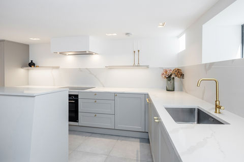 Conversion of this rare mews house inherent of an unusually high ground floor ceiling height and an already existing 1st floor extension. Already functioning as a 3-bedroom house the brief here was to create a more practical space and extend into the existing tiny courtyard but still allow for light to filtrate into the core living areas. The new study which fills this new extension is therefore built in frosted glass providing privacy as well as light. Further challenges faced was to screen off the main entrance to create a vestibule without stealing too much space from the main living area. With tones of grey, white and black, this monochrome home offers a calm, stylish and spacious home.